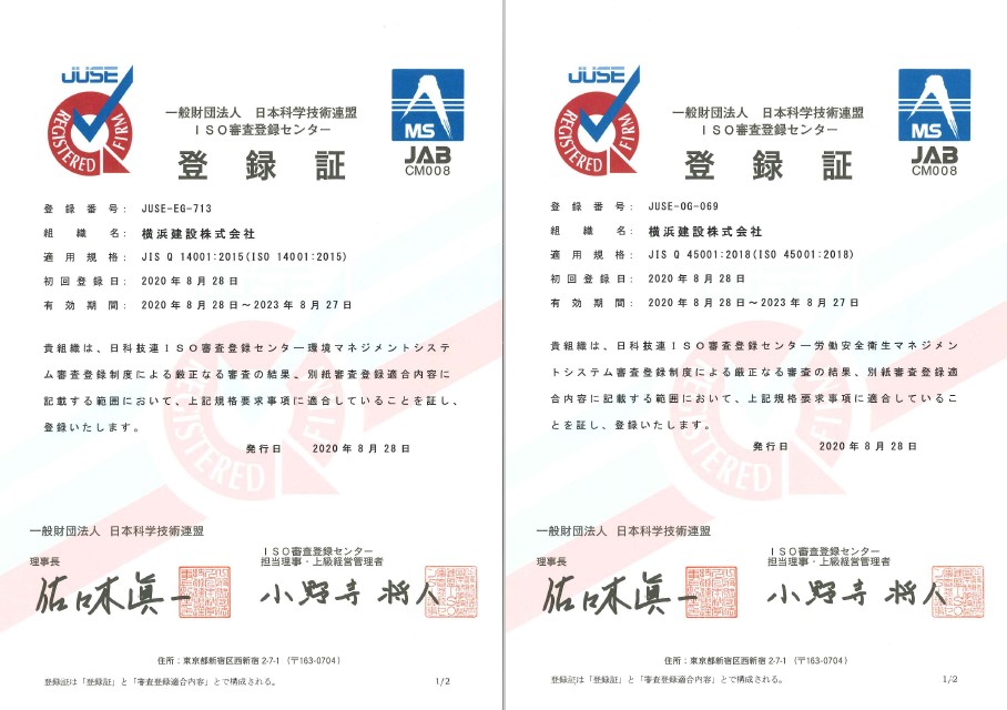 環境マネジメントシステム ISO14001、 労働安全衛生マネジメントシステム ISO45001 を認証取得しました。