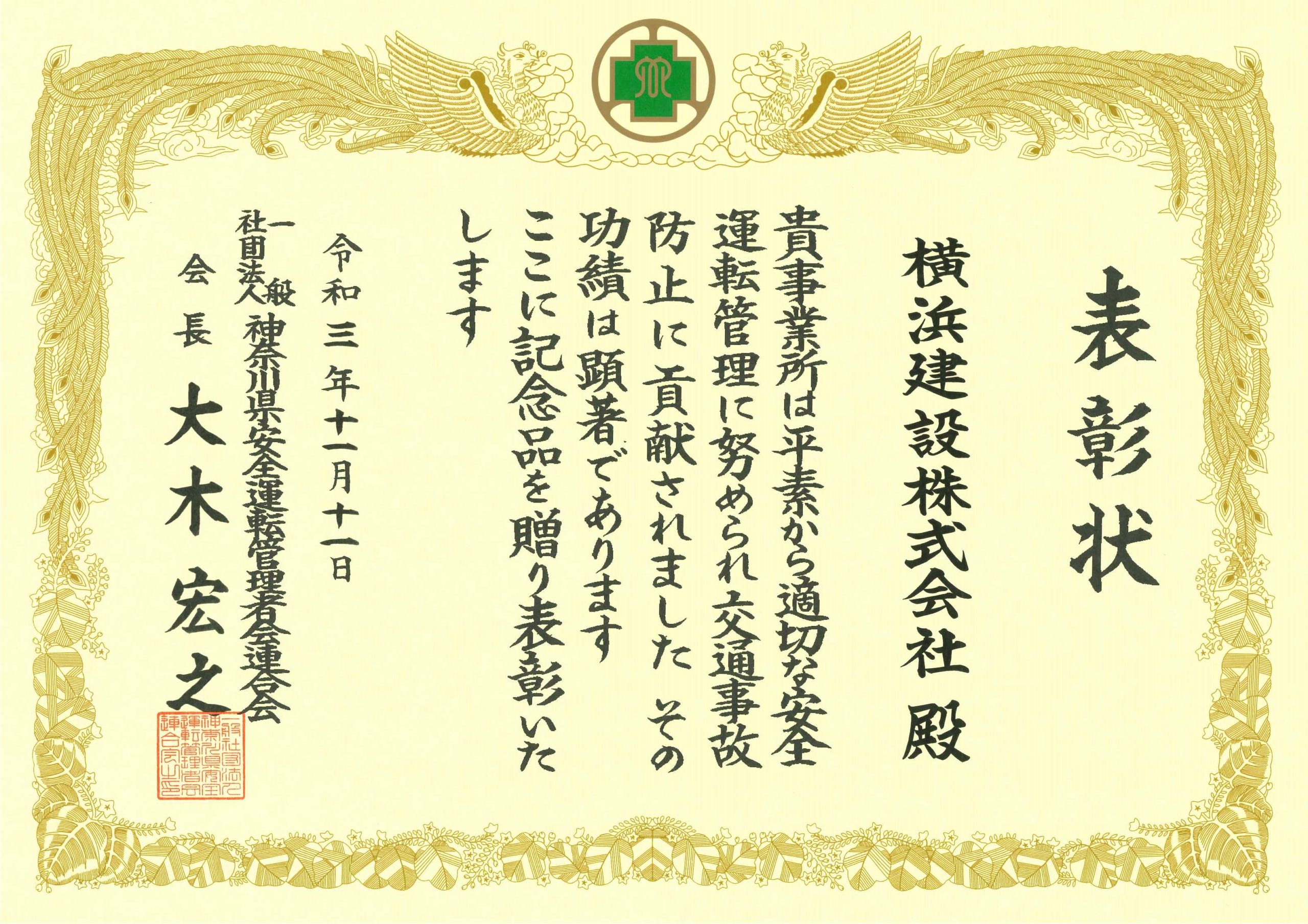 神奈川県安全運転管理者連合会より 適切な安全運転管理に努め、交通事故防止に貢献したとして表彰されました。