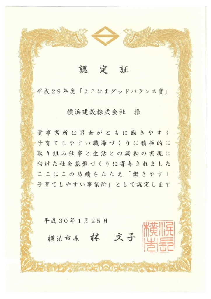横浜市より、29年度よこはまグッドバランス賞に認定されました。