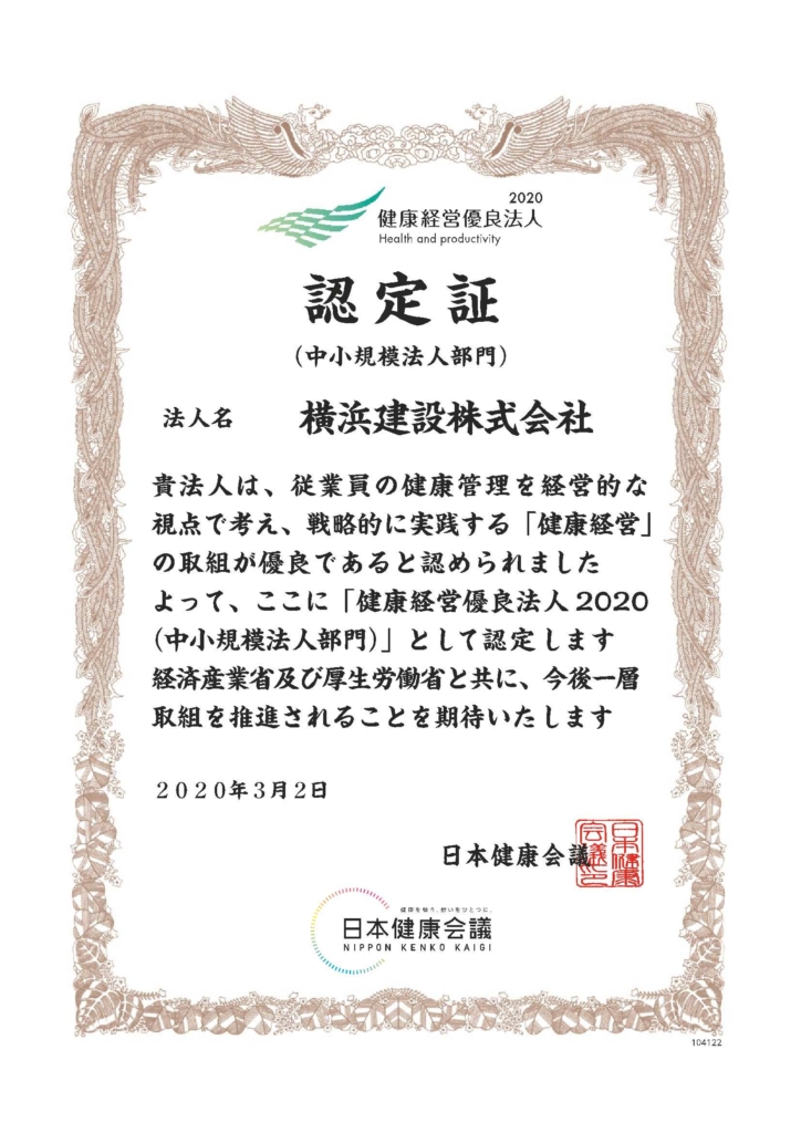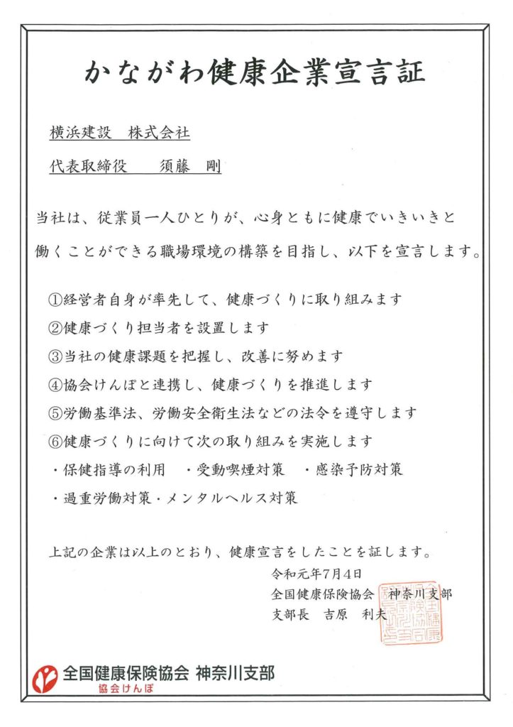 従業員の健康づくりを応援するため、全国健康保険協会「かながわ健康企業宣言」事業に参加し、「健康優良企業」に認定されました。