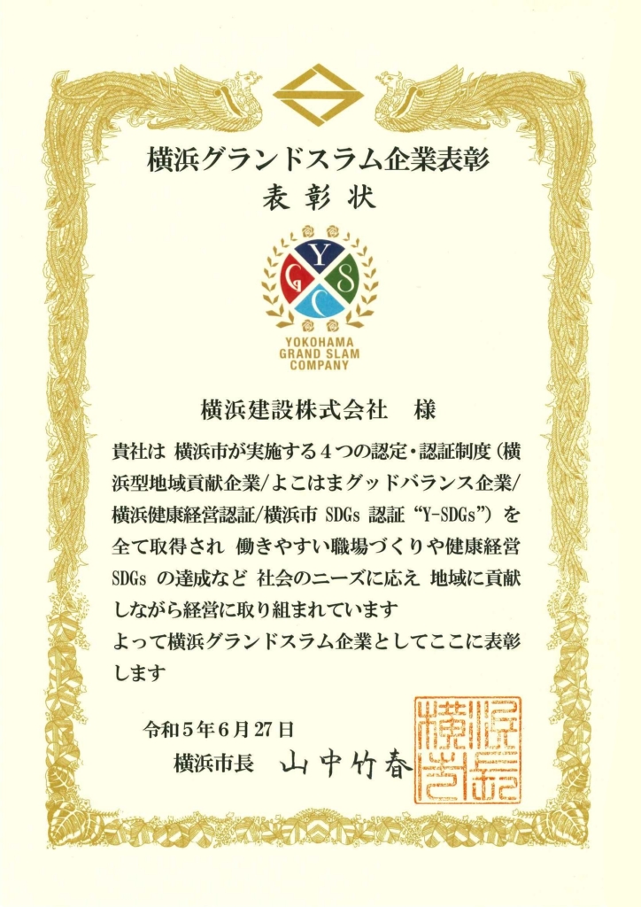 横浜グランドスラム企業は、 「横浜型地域貢献企業」「よこはまグッドバランス企業」「横浜健康経営認証」「横浜市SDGs 認証制度”Y-SDGs”」 の4つ全ての認定を受けた企業が表彰されます。 今後とも社会のニーズに応え、地域に貢献しながら経営に取り組んで参ります。